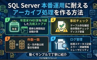 SQL Serverで本番運用に耐えるアーカイブ処理を作る方法を解説。年度末YM計算を内蔵した汎用ストアド、事前チェック、件数一致、ログ管理まで動くサンプルで丁寧に紹介。
