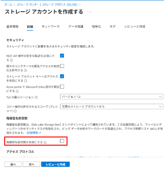 Azureでストレージアカウントを作成する際、**「詳細設定」タブにある「階層型名前空間を有効にする」**というチェックボックスを操作するだけです。