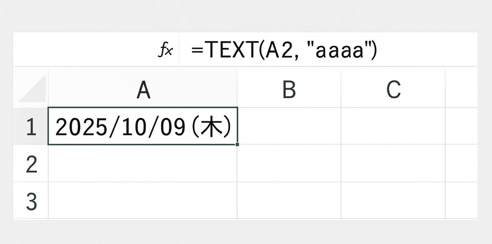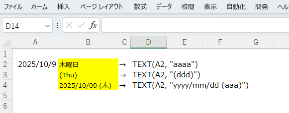 =TEXT(A2, "aaaa")→ 「木曜日」=TEXT(A2, "(ddd)")→ 「(Thu)」=TEXT(A2, "yyyy/mm/dd (aaa)")→ 「2025/10/09 (木)」