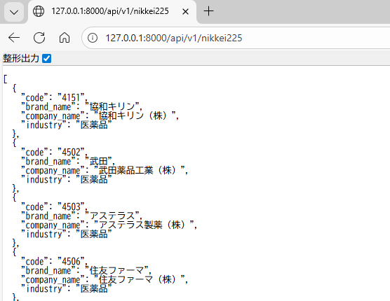 URLに127.0.0.1:8000/api/v1/nikkei225を入力すると、以下のようにJSON形式で日経225の銘柄がJSON形式で取得できるようになりました。