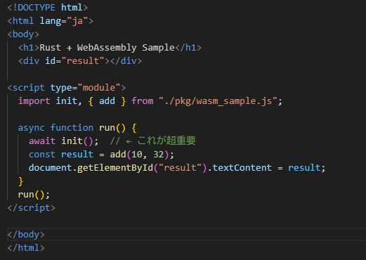 wasm-bindgen = "0.2"5. Rust コードを書く