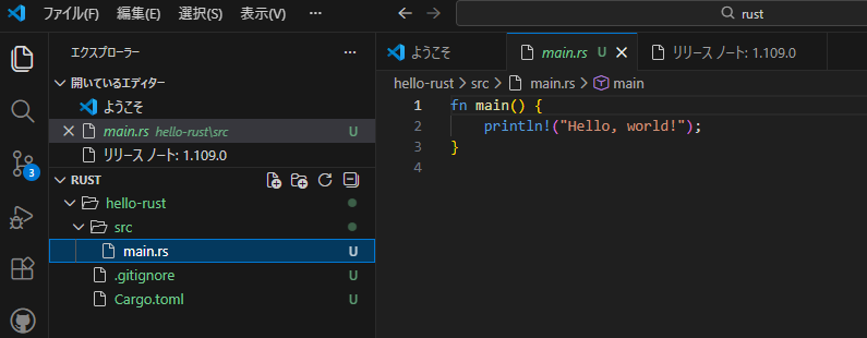 Hello, world!これで Rust が動作しました。