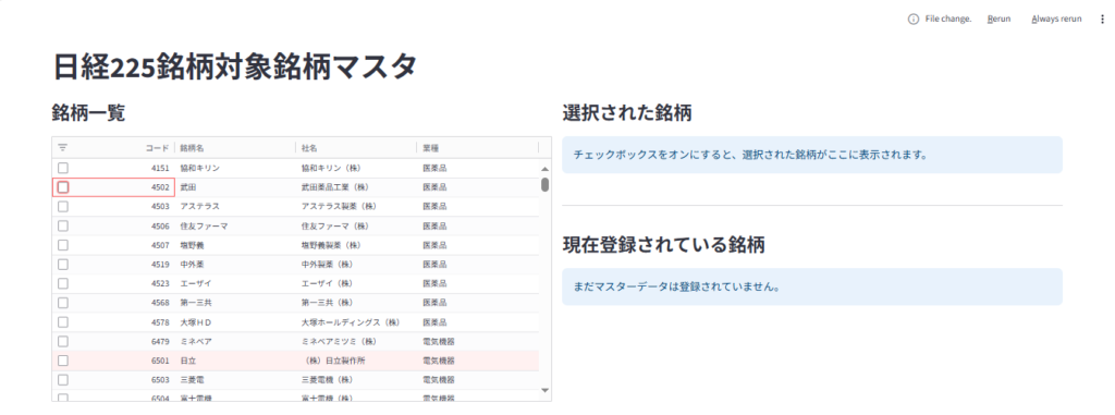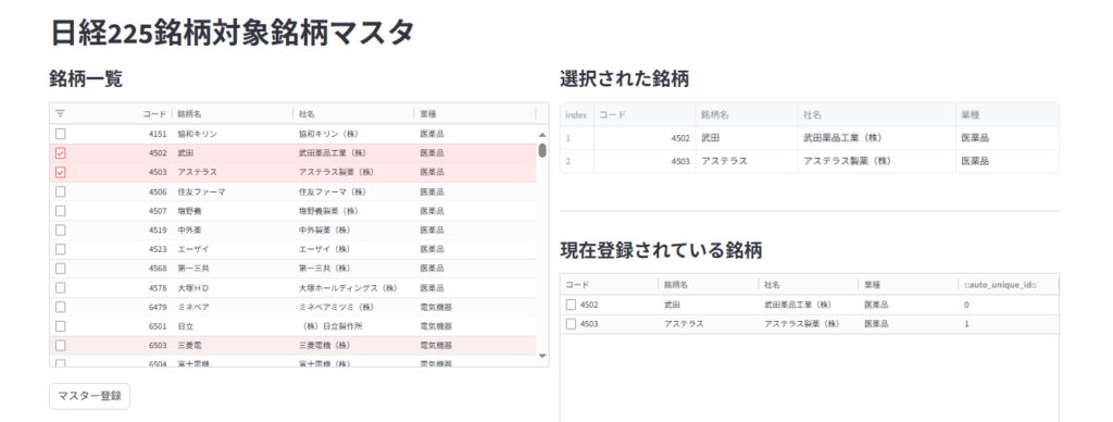 日々の業務で株式銘柄の管理を行う際、Excelでの手作業は煩雑になりがちです。そこで今回は、PythonのWebアプリフレームワーク「Streamlit」と、表形式UIコンポーネント「AgGrid」を組み合わせて、日経225銘柄の選択・登録・削除ができるマスタ管理アプリを構築しました。