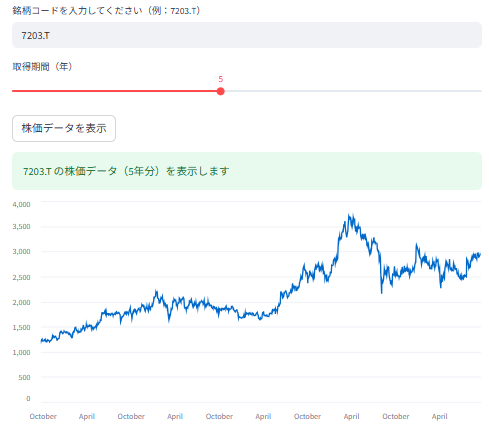 | 📈 期間指定 | 株価や売上などの時系列データの取得 | years = st.slider("取得期間", 1, 10, 5) |