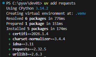 プロジェクトにライブラリを追加してみます。pipと同じ感覚で操作できます。