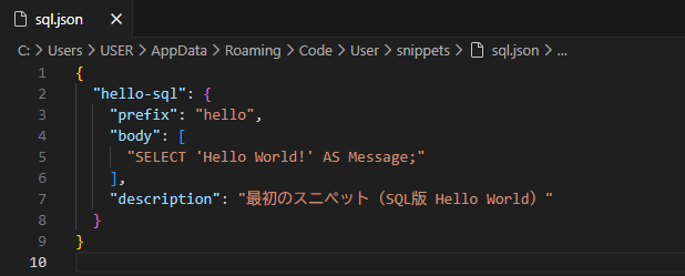 %APPDATA%\Code\User\snippets\sql.json5-3. スニペットファイルの構造