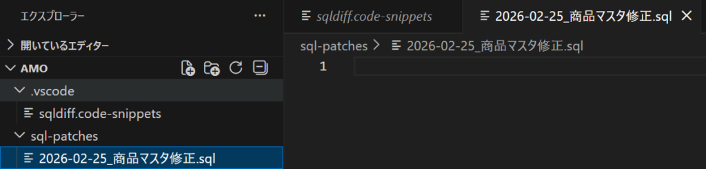VSCodeを開いて、パッチ作業用に .sql ファイルを作成します。