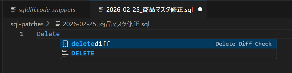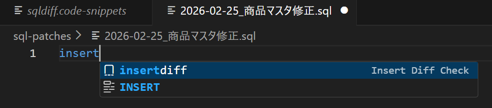 sqldiff.code-snippetsの"prefix"を変更すれば、 たとえばidiffやdiff-insertのように、自分の好みに合わせてカスタマイズできます!